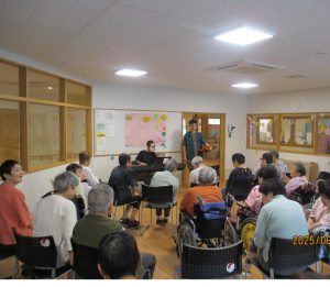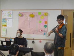 敬老会の催しとして外部演奏者によるバイオリンの演奏と演奏クイズが行われました。クイズに正解するとメダルが貰えます。
