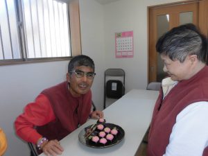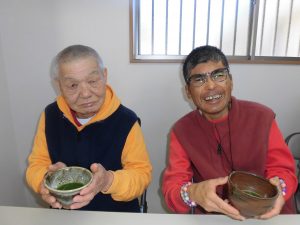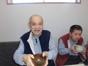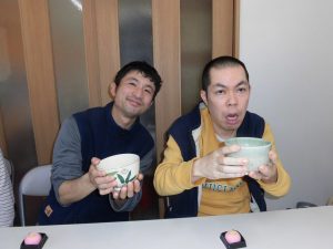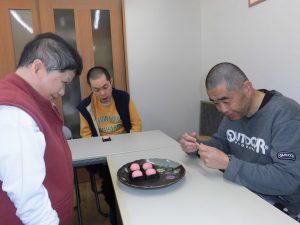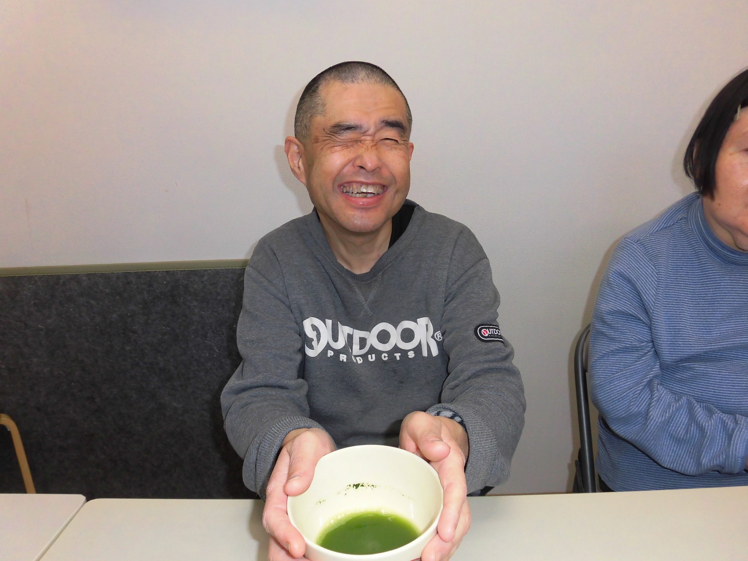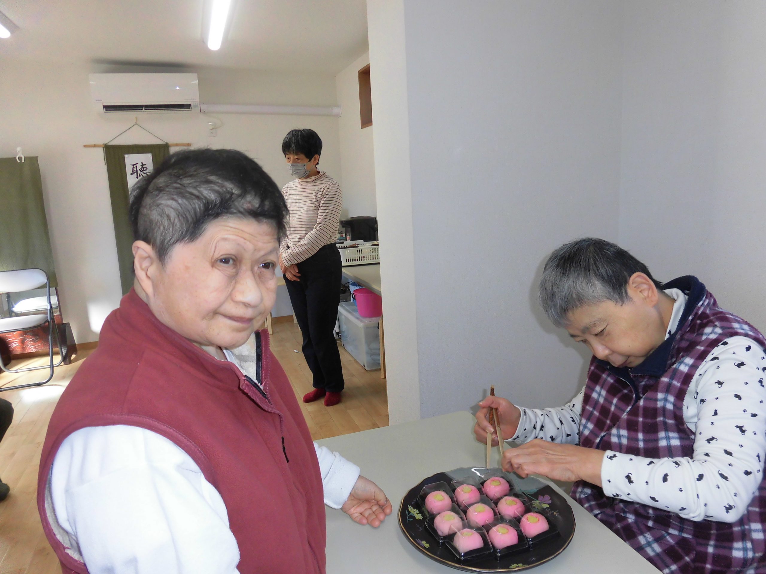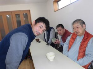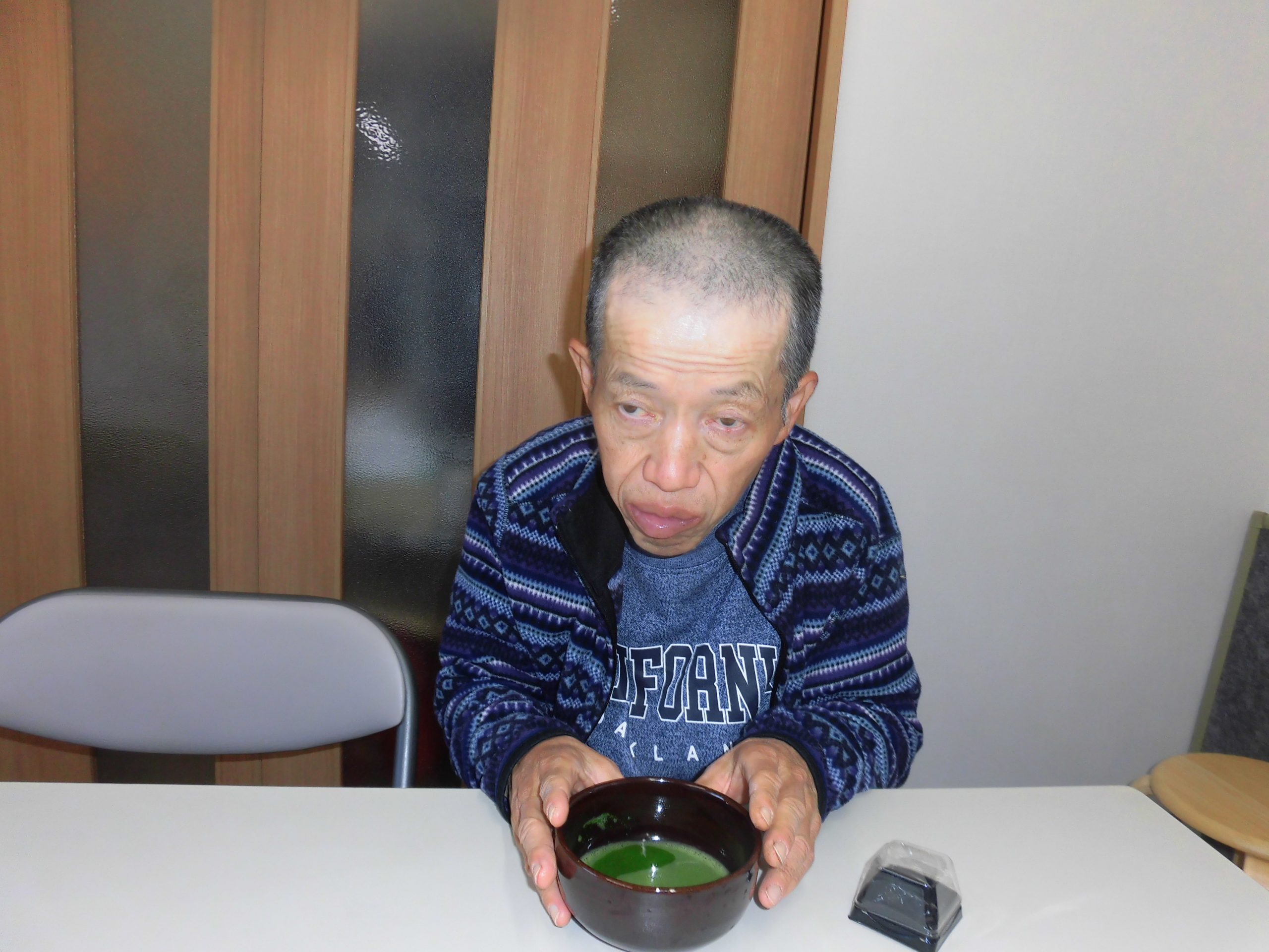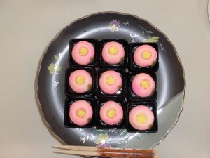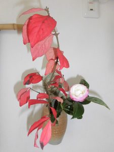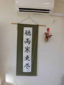 今年の秋は各地で熊騒動が絶えません、皆が住む足尾町も熊が生息する地域ですが幸い、最近は熊の目撃情報も少ないです。よく言う、アーバンベアーが生息していない地域の様です。外の空気の冷たくなり、インフルエンザの季節に入り予防に心がけております。今月のお軸は「聴雨寒更尽」(ちょううかんこうじん)意味は雨の音を聞きながら、寒さが深まる様子を表現しています。心を静め、自然の変化を感じ取る事が大切です。お菓子は「椿」。お花は照葉、椿。