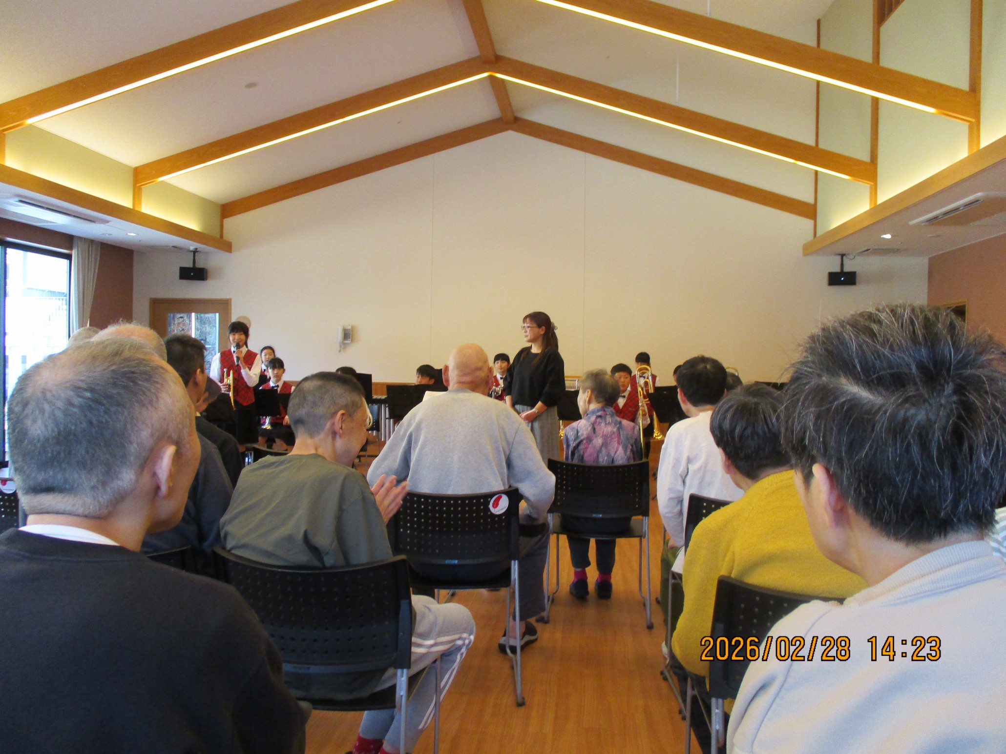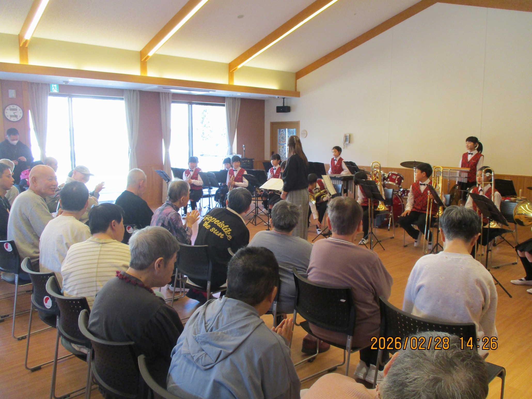 ブラスバンドの演奏はしっかり練習されている事がわかる様な綺麗な演奏でした。金管や太鼓の音圧が迫力満点で、ご利用者の皆様も