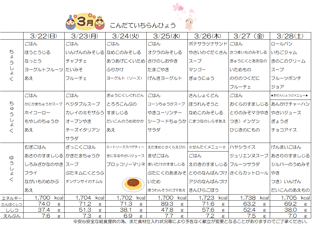 スクラムあらかわ週間献立表(3/22~28)
